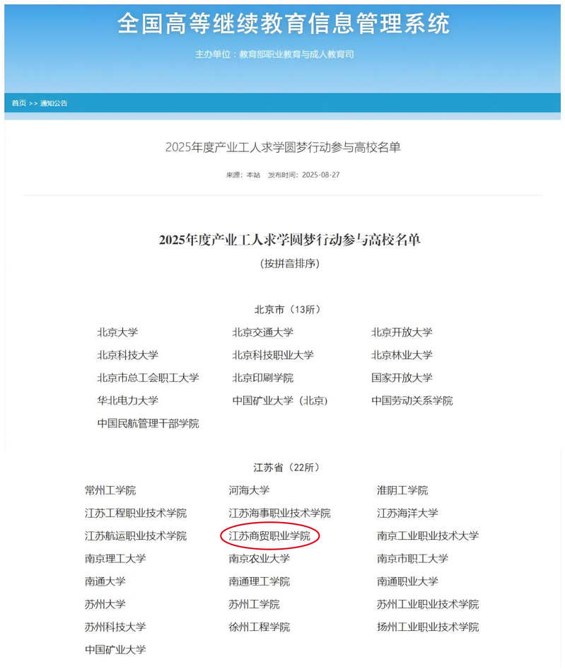 “产业工人求学圆梦行动”由教育部组织实施,旨在支持更多高校面向产业工人开展学历继续教育和职业技能培训,助力现代化产业体系人才培养。经院校申报、省厅遴选推荐、教育部专家综合评议,全国共确定289所高校纳入本年度项目名单,其中江苏省共有22所高校入选。
