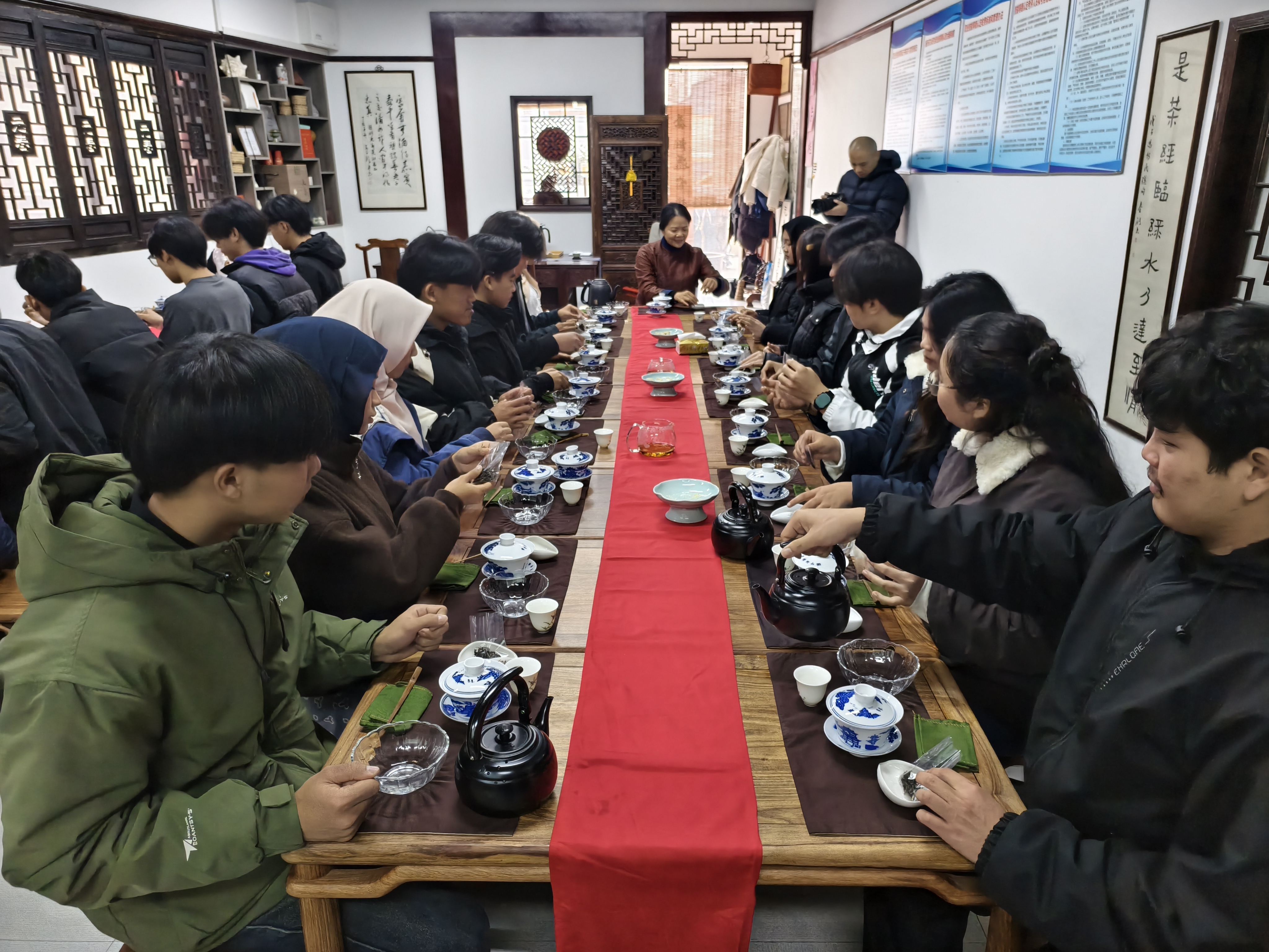 为增进我校留学生对中国优秀传统文化的认知与理解,体验中国茶艺的东方智慧与生活美学。1月28日,江苏商贸职业学院29名寒假留通的印度尼西亚、泰国留学生,在继续教育学院、国际教育与交流学院副院长包勇的带领下,来到南通茶文化研究会开启沉浸式茶文化体验之旅。国家级高级茶艺技师现场授课,引领留学生溯源千年茶文化,学校国教院教师代表全程参与。